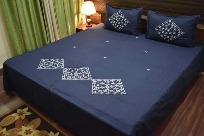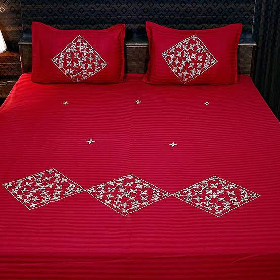 Machine embroidered bedsheet with 2 pillow covers; embroidery on bedsheet & pillow covers; no colour bleeding; no shrinkage, bubble and wrinkle free; machine washable ; Colours available: Red, maroon, navy blue , yellow