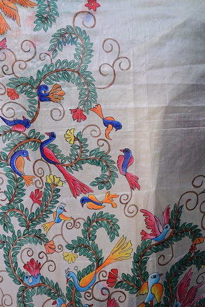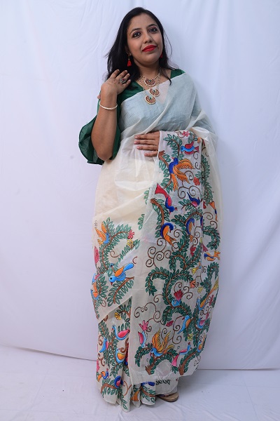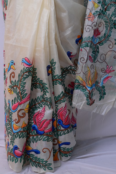 Modern handpainted design with a mix of fine art & freestyle; Sari depicts a lush greenscape with the most beautiful & attracive birds beneath the white sky; a unique artistic & modern sari patern; bottom border : 20-22″ hand painted design from bottom on complete sari; Pallu: 1/2 meter work on pallu; colour: off-white