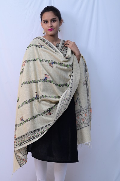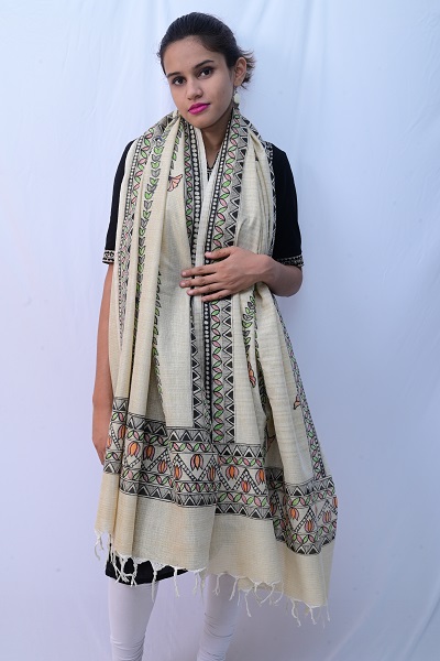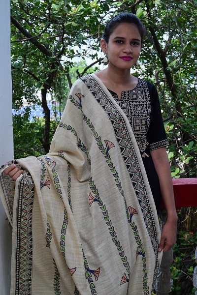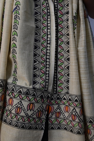 5″ traditional madhubani border with lotus motifs on both ends of the dupatta; 3″ border on the other two sides of the dupatta; Vertical panels on overall dupatta with bellflower pattern makes it elaborate and unique; wearable with almost any colour kurta